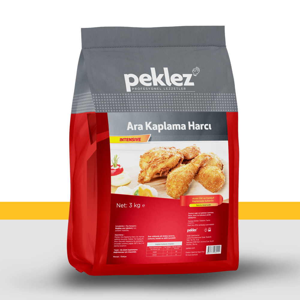 Gelince Haber VerBonservis’in “Tatlıcılık, Pastacılık, Ekmekçilik Ham maddeleri” kategorisinde yer alan Peklez Ara Kaplama harcı, 3000 gramlık paketlerde toz formda satışa sunulur. Çeşitli ürünlerin marine edilmesinde kullanılan ara kaplama, reçetelerinize enfes bir lezzet katar. Peklez Ara Kaplama ile marine edeceğiniz tavuk ya da et gibi ürünlerin dış kaplamasında çıtır tel kadayıf tercih edebilirsiniz. Kullanımı son derece pratik olan çıtır kaplama harcı, müşteri yoğunluğu yüksek olan ve zamanla yarışan işletmeler için mükemmel bir seçenek oluyor. Marine ve kaplamasını tamamladığınız ürünleri isteğe göre tavada, fırında ya da fritözde kolay bir şekilde pişirebilirsiniz.